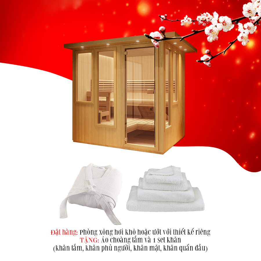 Khi đặt hàng phòng xông hơi khô hoặc ướt với thiết kế riêng có giá trị từ 20.000.000VNĐ – 50.000.000VNĐ khách hàng sẽ được tặng áo choàng tắm + 01 set khăn (khăn tắm, khăn phủ người, khăn mặt, khăn quấn đầu)
