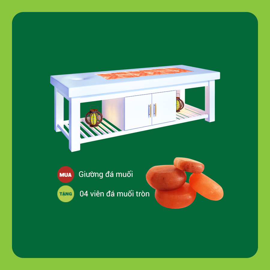 ♦ Khi mua 01 giường đá muối trị giá 8.000.000VNĐ sẽ được tặng 04 viên đá muối tròn trị giá 332.000VNĐ.