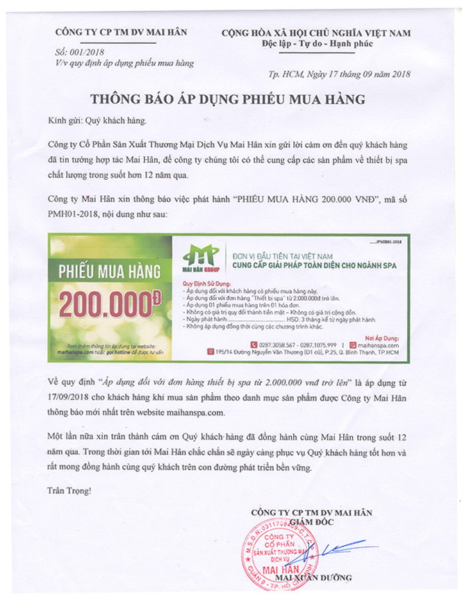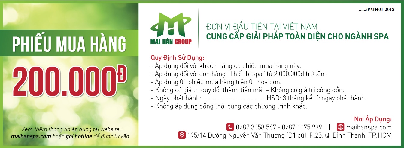 Qua hơn 12 năm hoạt động với tinh thần ĐAM MÊ – NHIỆT HUYẾT – TẬN TÂM, Mai Hân Group đã thực hiện hơn 1347 dự án cho hơn 1347 spa theo đúng chuẩn. Với mong muốn đem lại những giá trị thiết thực, hữu ích, hỗ trợ mở - kinh doanh spa hiệu quả hơn nữa, đáp ứng tốt nhu cầu khỏe - đẹp tăng mạnh, Mai Hân Group quyết định đưa ra Phiếu mua hàng 200.000VNĐ với mã số PHM01-2018 với nội dung như sau: