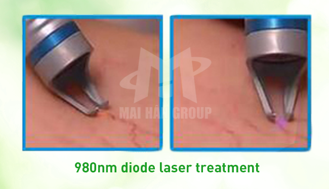 Laser bán dẫn 980nm sử dụng công nghệ sợi quang học nhập khẩu từ nước ngoài thông qua một bước sóng nhất định xuyên qua lớp biểu bì đến nơi mao mạch bị giãn, căn cứ vào nguyên lí quang nhiệt có tính chọn lọc, thông qua công nghệ với vai trò tạm dẫn hướng mục tiêu vào mao mạch, ngay lập tức sẽ làm cho hemoglobin trong mạch máu bị bắn vỡ rồi bị hấp thụ, ngay lập tức mạch máu sẽ bị co nhỏ lại, đây chính là mục đích của quá trình điều trị. Ngoài ra, Laser bán dẫn 980nm có thể tăng sinh collagen, làm lớp biểu bì của da thêm dày, giúp cho các mạch máu đỏ sẽ không dễ xuất hiện ra bên ngoài da.